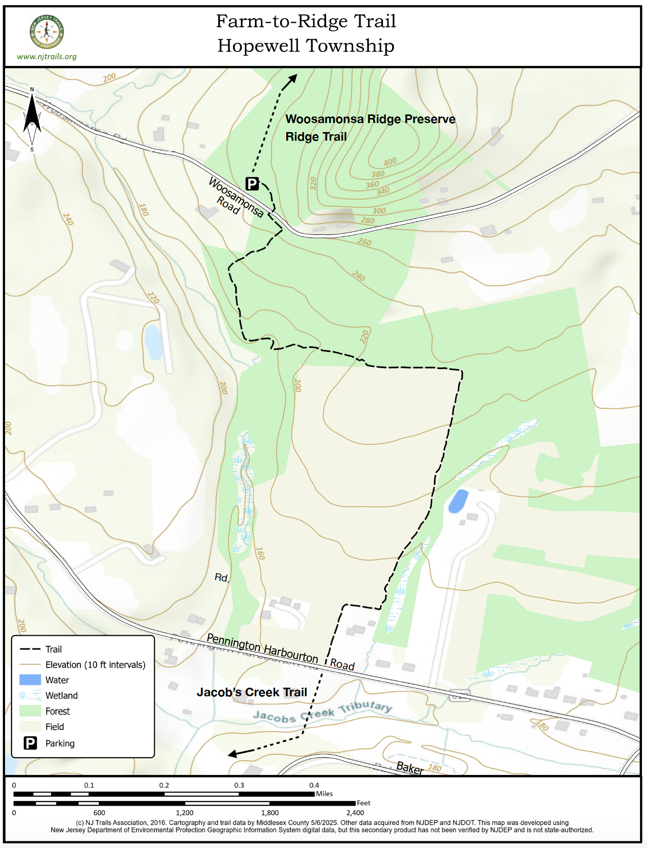 Park at the lot for Woosamonsa Ridge Preserve on Woosamonsa Road, then walk from its kiosk along the marked path to Woosamonsa Road, across from the Farm-to-Ridge Trail entrance. No parking at Pennington-Harbourton Road.
